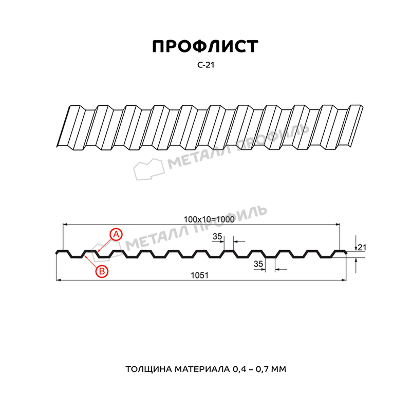 Профлист изготовлен из металла толщиной 0.45 мм, что обеспечивает ему высокую прочность и долговечность. Он имеет форму С-21, которая обеспечивает надежное соединение и защиту от протекания.