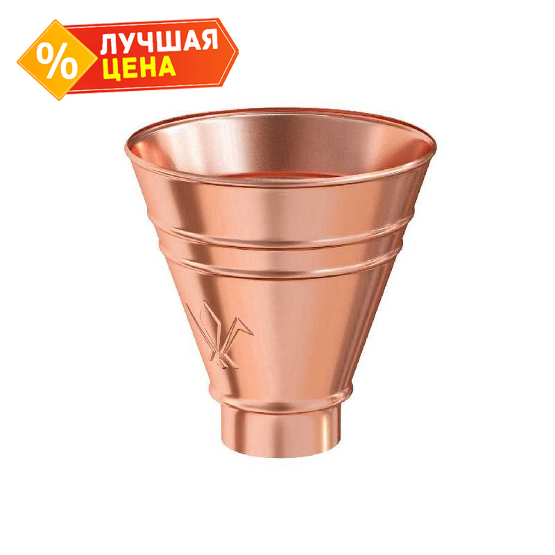 Воронка водосборная круглая, 90/125, Медь - это стильный и функциональный аксессуар для сбора дождевой воды. Изготовлена из прочного материала - меди, что обеспечивает ей долговечность и надежность. Ее диаметр составляет 90 мм, а выходной диаметр - 125 мм, что позволяет эффективно собирать воду с крыши и направлять ее в нужное место. Воронка имеет круглую форму, что облегчает ее установку и обеспечивает оптимальный сбор воды. Благодаря своему дизайну воронка выглядит эстетично и подходит для любого стиля дома. Этот товар является незаменимым помощником в сохранении и использовании дождевой воды, а также способствует экологическому образу жизни.
